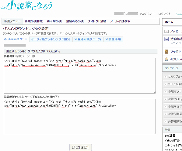 確認ページ 『設置場所:目次ページ下部』と『設置場所:各小説ページ下部(あとがき欄の下)』両方に 先ほど作成したタグを貼り付け、